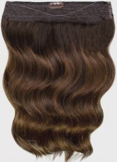 Achieve fuller, thicker hair in seconds with our 16 inch Invisible Wire Hair Extensions in Mocha & Medium Brown Balayage. Crafted from 100% Remy human hair, this innovative one-piece extension offers a comfortable, lightweight, and temporary alternative to traditional methods like clips, glues, beads, and weaves.