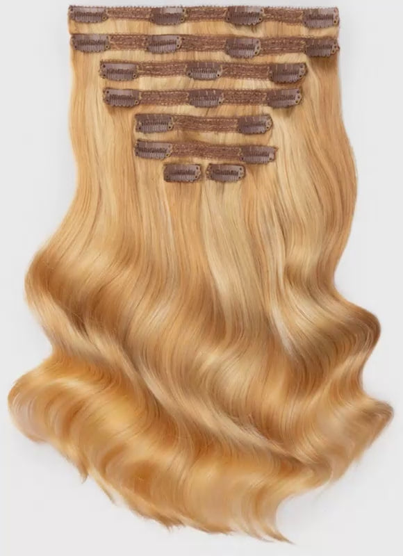 Take your look to the next level with our 20 inch Deluxe Clip-In Hair Extensions in Light Blonde with Strawberry Blonde Highlights. Crafted from the highest grade 100% genuine Remy human hair, these premium extensions provide luxurious length, volume, and a soft, silky finish that blends seamlessly with your natural hair.