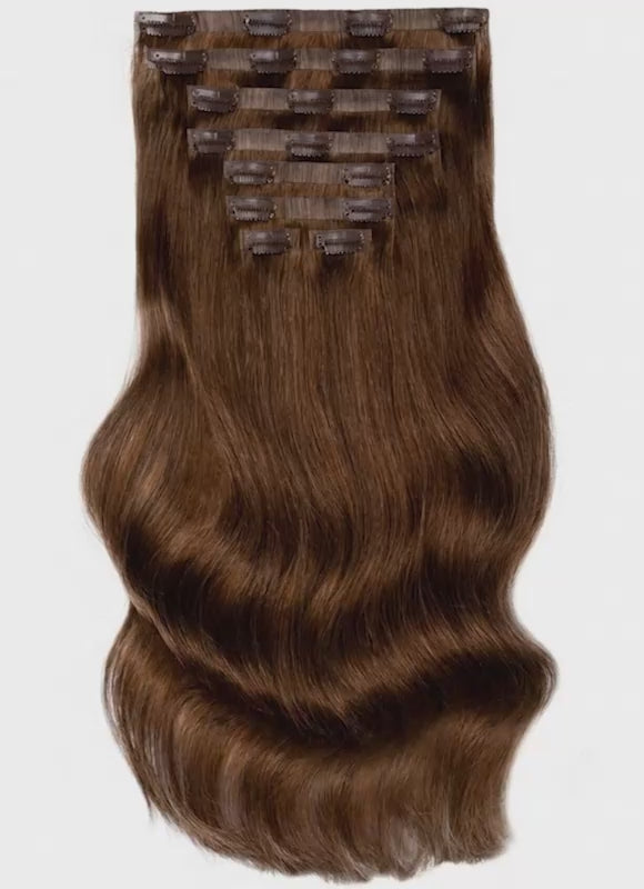 Our 20” Seamless Clip-In Hair Extensions in Dark Brown blend effortlessly for a flawless finish. Crafted with ultra-lightweight, invisible wefts, they lie flat against the scalp for a discreet and comfortable fit. Made from the highest grade 100% genuine Remy human hair, these extensions deliver silky softness, natural movement, and long-lasting wear. Each weft features premium metal clips lined with silicone for a secure, gentle hold that stays in place all day.