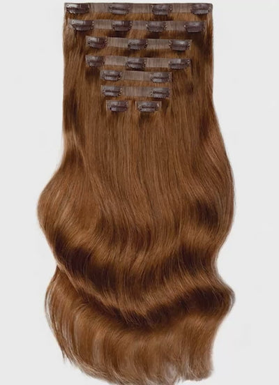 Our 20” Seamless Clip-In Hair Extensions in Medium Brown blend effortlessly for a flawless finish. Crafted with ultra-lightweight, invisible wefts, they lie flat against the scalp for a discreet and comfortable fit. Made from the highest grade 100% genuine Remy human hair, these extensions deliver silky softness, natural movement, and long-lasting wear. Each weft features premium metal clips lined with silicone for a secure, gentle hold that stays in place all day.